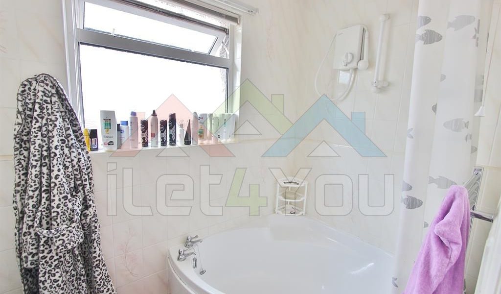 Bathroom Comprising of a three piece white suite, the bathroom includes a low level WC, a pedestal hand wash basin, a heated chrome finished towel rail, a side facing uPVC double glazed obscured window, tiled walls, tiled floorings and a corner bath with an electric shower above it.