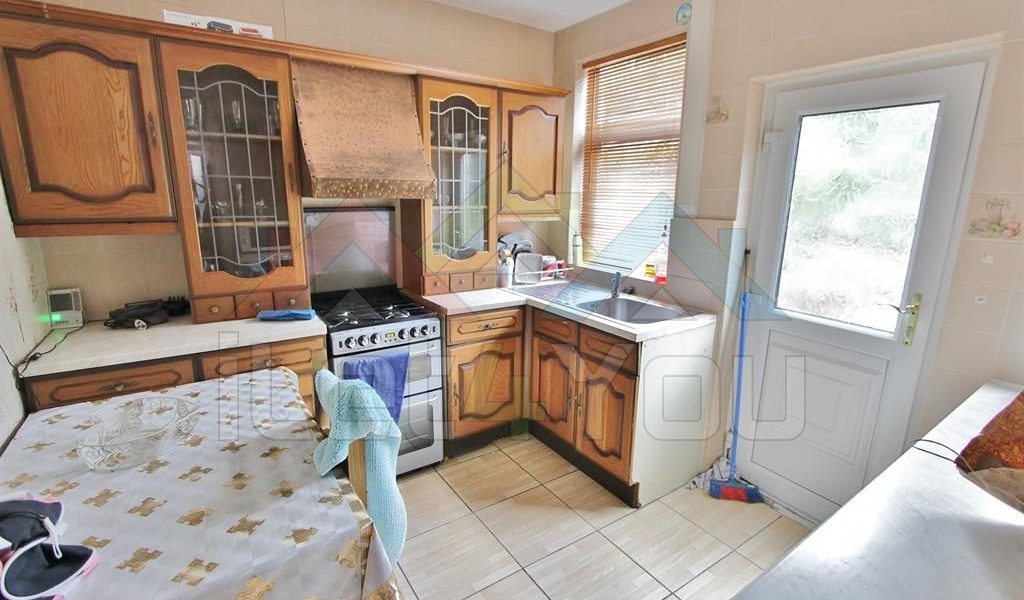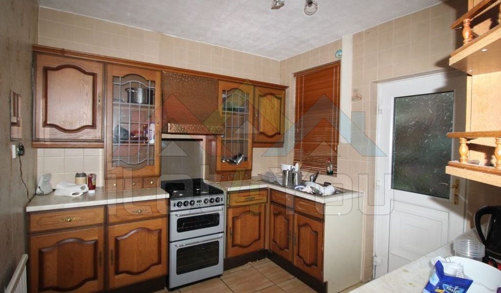 Kitchen This room comprises of a range of wood effect wall, base and drawer units with rolled edge countertops which house the sink with side drainer and mixer tap. There is space for multiple appliances which include a free standing double oven, an under counter washing machine and an under counter fridge and freezer. Also there are two rear facing uPVC double glazed windows, tiled floor, a central heating radiator, tiling to splash prone areas and a partially double glazed uPVC door which allows access to the rear garden.